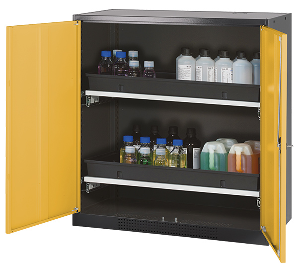 Body colour anthracite grey (RAL 7016), with wing doors in warning yellow (RAL 1004), interior equipment with 2 x pull-out shelf (sheet steel/polypropylene powder-coated)