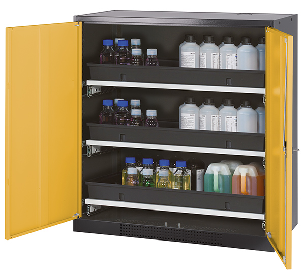 Body colour anthracite grey (RAL 7016), with wing doors in warning yellow (RAL 1004), interior equipment with 3 x pull-out shelf (sheet steel/polypropylene powder-coated)