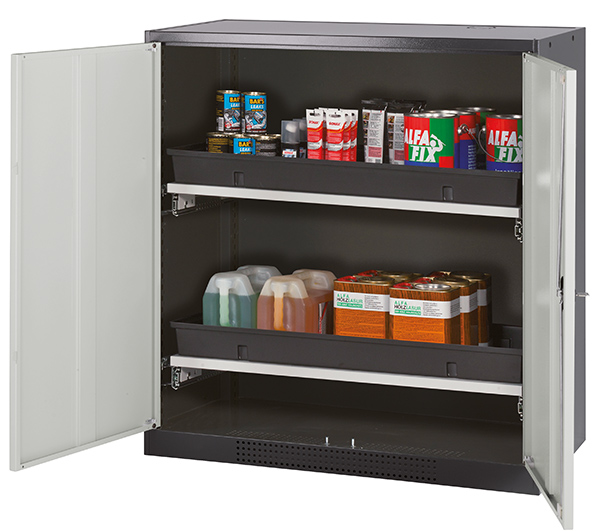 Body colour anthracite grey (RAL 7016), with wing doors in light grey (RAL 7035), interior equipment with 2 x pull-out shelf (sheet steel/polypropylene powder-coated)