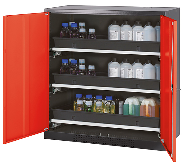 Body colour anthracite grey (RAL 7016), with wing doors in traffic red (RAL 3020), interior equipment with 3 x pull-out shelf (sheet steel/polypropylene powder-coated)