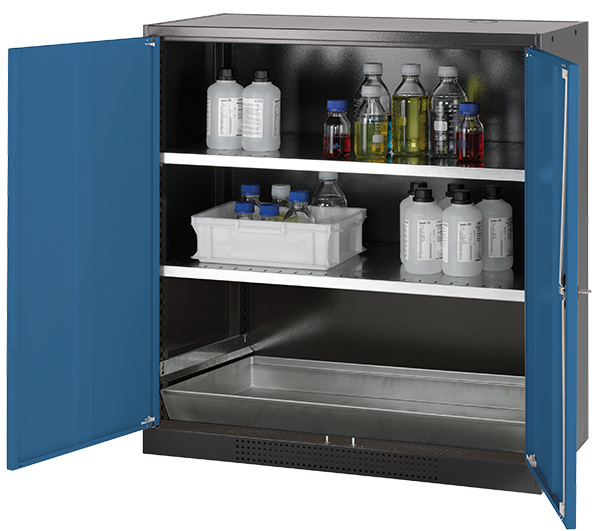 Body colour anthracite grey (RAL 7016), with wing doors in gentian blue (RAL 5010), interior equipment with 2 x shelf, 1 x bottom collecting sump (sheet steel galvanised)