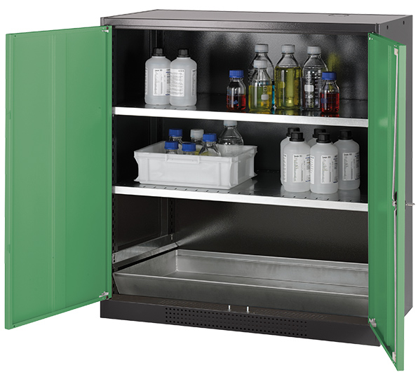 Body colour anthracite grey (RAL 7016), with wing doors in Reseda green (RAL 6011), interior equipment with 2 x shelf, 1 x bottom collecting sump (sheet steel galvanised)