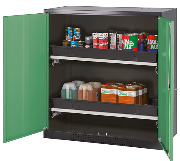 Body colour anthracite grey (RAL 7016), with wing doors in Reseda green (RAL 6011), interior equipment with 2 x pull-out shelf (sheet steel/polypropylene powder-coated)