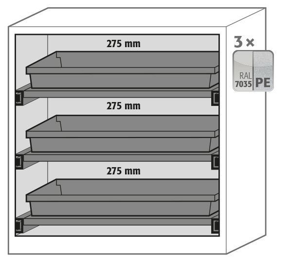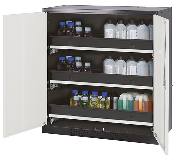 Body colour anthracite grey (RAL 7016), with wing doors in asecos silver, interior equipment with 3 x pull-out shelf (sheet steel/polypropylene powder-coated)
