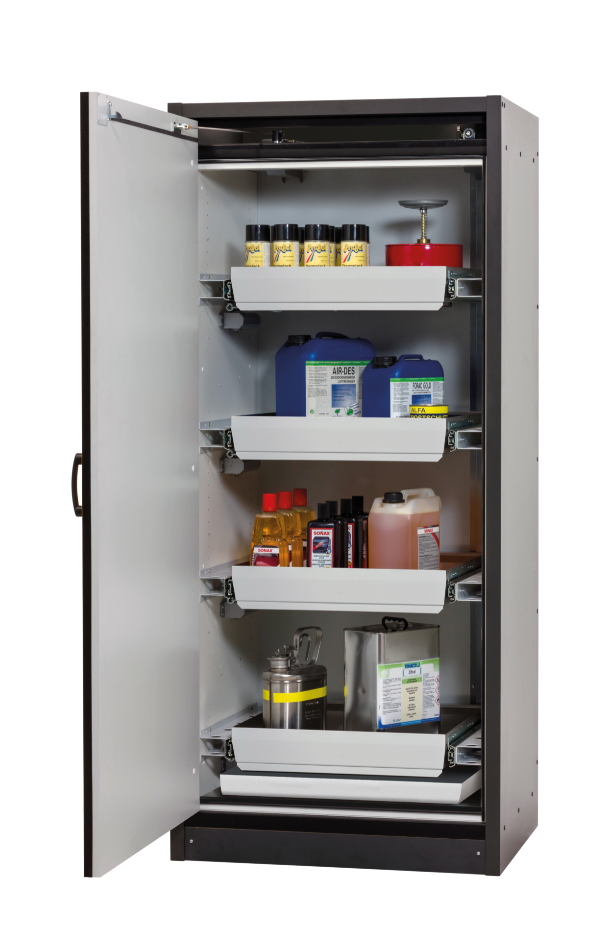 Body colour anthracite grey, with wing door in warning yellow (RAL 1004), interior equipment with 4 x drawer, 1 x bottom collecting sump (sheet steel powder-coated)