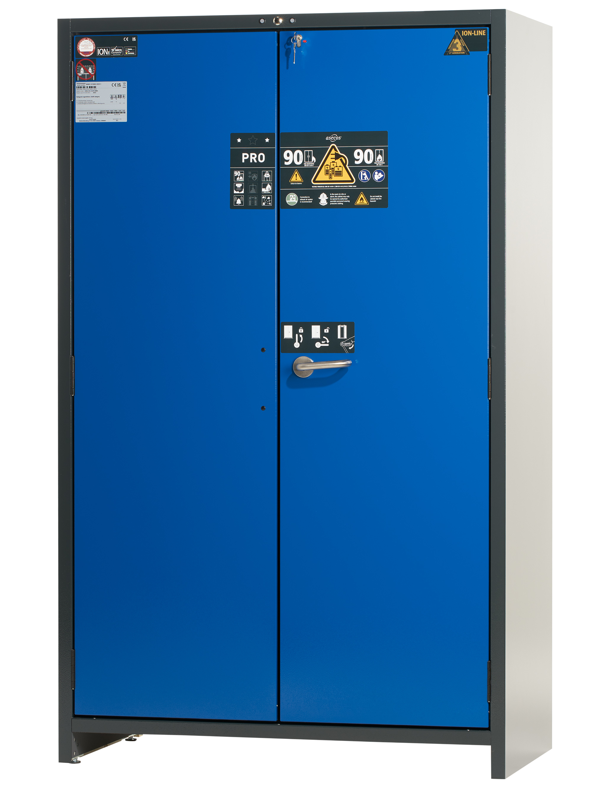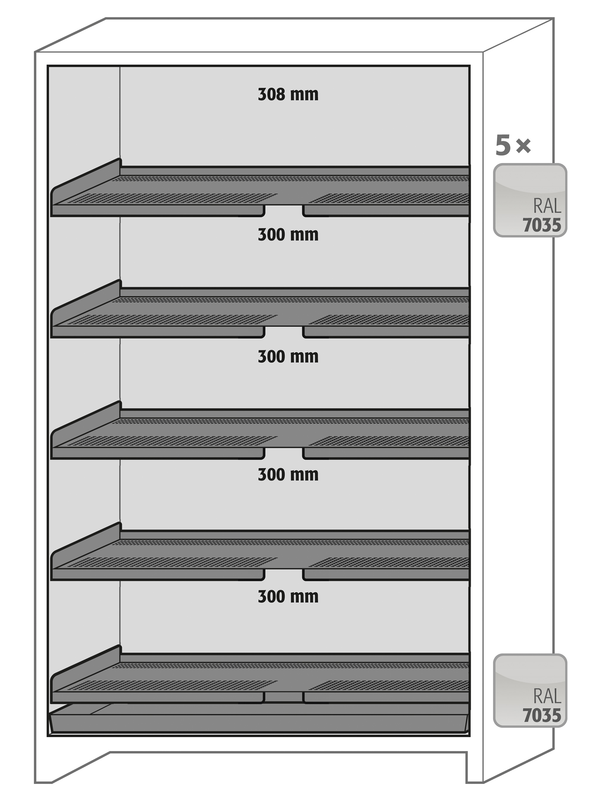 color del cuerpo gris antracita (RAL 7016), con puertas batientes en azul genciana (RAL 5010), equipamiento interior con 5 x Bandeja aislada, 1 x cubeto de retención (plancha de acero recubrimiento plástico)