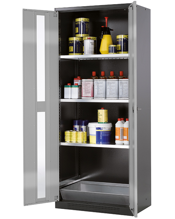 Rungon väri antrasiitinharmaa (RAL 7016), siipiovet ikkunoilla asecos hopea, sisätilavarusteet 3 x hylly, 1 x pohja-allas ( teräslevy galvanoitu)