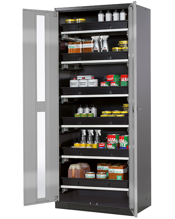 Rungon väri antrasiitinharmaa (RAL 7016), siipiovet ikkunoilla asecos hopea, sisätilavarusteet 6 x vetohylly ( teräslevy/PP jauhemaalattu)