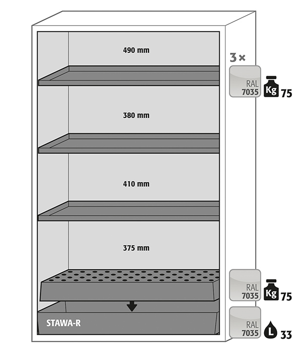 vaaleanharmaa (RAL 7035), sisätilavarusteet 3 x hylly, 1 x rei'itetty insertti, 1 x pohja-allas ( teräslevy jauhemaalattu)