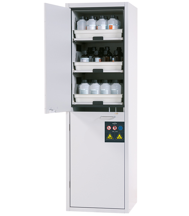 - kaksi yhdessä: kaksi hermeettisesti eristettyä säilytysosastoa sallii eristettyjen happojen ja emästen säilytyksen yhdessä kaapissa