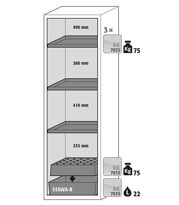gris clair (RAL 7035), équipée avec 3 x étagère, 1 x caillebotis, 1 x bac de rétention au sol (tôle d'acier revêtement époxy)