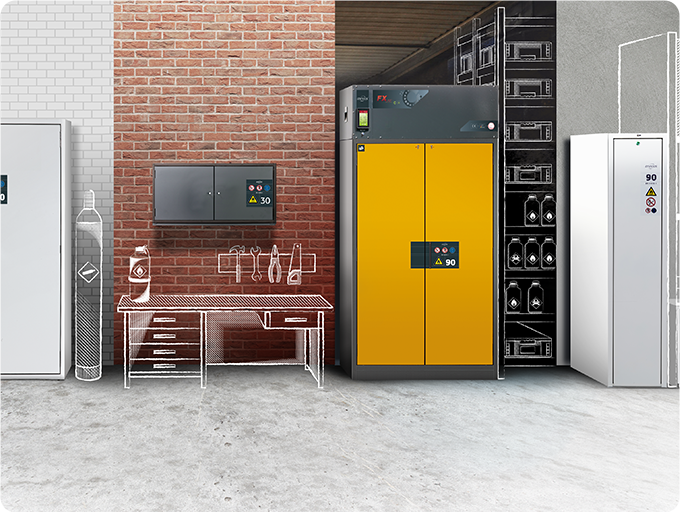 Neem bij de configuratie van een veiligheidskast de geldende nationale regels en voorschriften voor de opslag van gevaarlijke stoffen in acht. Als u het niet zeker weet, helpen de experts van DENIOS u graag verder