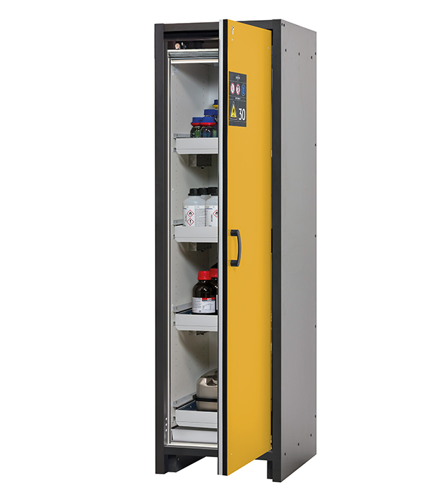 rompkleur antracietgrijs, met draaideur in signaalgeel (RAL 1004), Interieur met 4 x schuiflade, 1 x bodemopvangbak (plaatstaal met epoxy coating)
