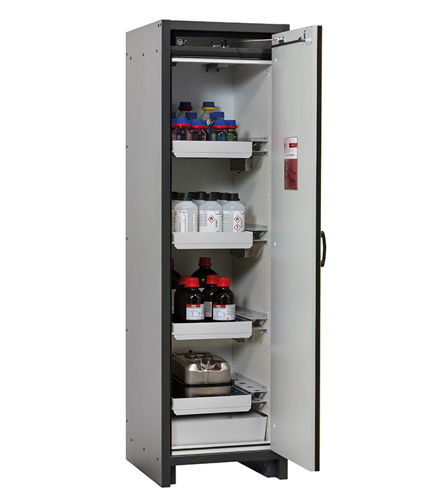 rompkleur antracietgrijs, met draaideur in signaalgeel (RAL 1004), Interieur met 6 x schuiflade, 1 x bodemopvangbak (plaatstaal met epoxy coating)