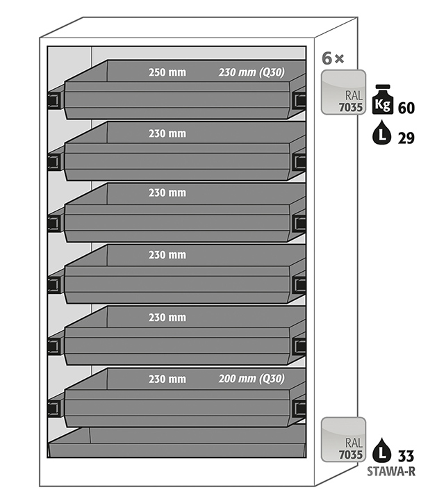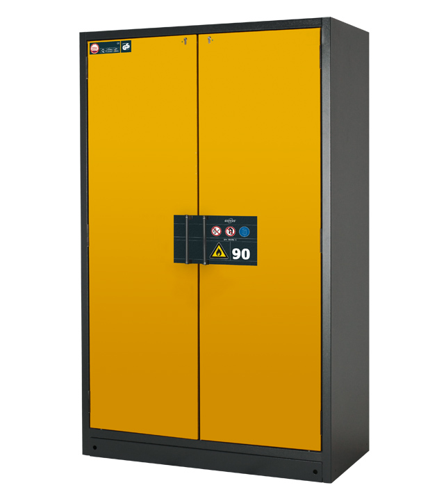 rompkleur antracietgrijs (RAL 7016), met draaideuren in signaalgeel (RAL 1004), Interieur met 6 x schuiflade, 1 x bodemopvangbak (plaatstaal met epoxy coating)