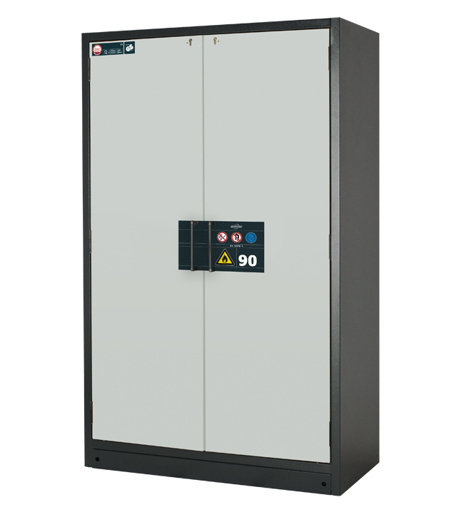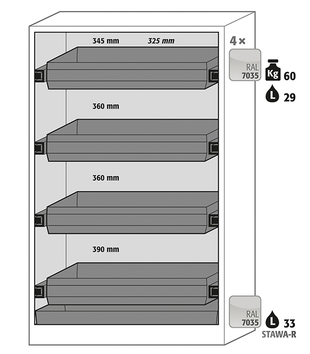rompkleur antracietgrijs (RAL 7016), met draaideuren in Lichtgrijs (RAL 7035), Interieur met 4 x schuiflade, 1 x bodemopvangbak (plaatstaal met epoxy coating)