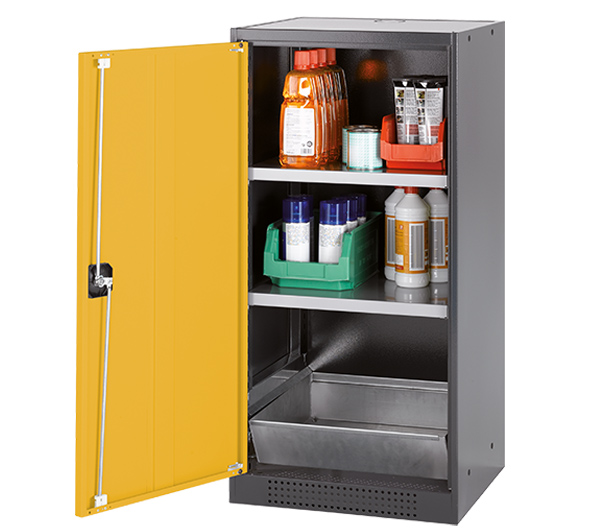 Skåpets färg Antracit grå (RAL 7016), med flygeldörr i Varning gul (RAL 1004), inredning med 2 x hylla, 1 x bottentråg (stålplåt galvaniserad)
