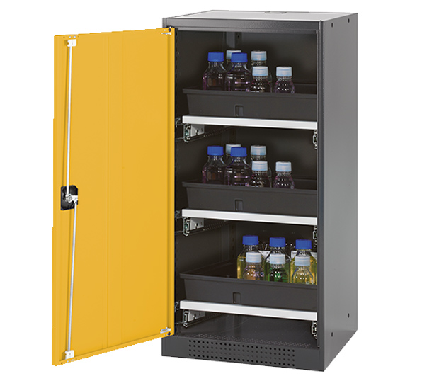 Skåpets färg Antracit grå (RAL 7016), med flygeldörr i Varning gul (RAL 1004), inredning med 3 x utdragbar hylla (stålplåt/polypropen pulverlackerad)