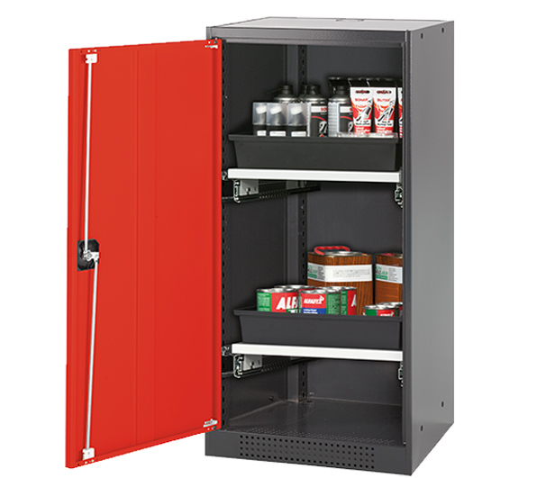 Skåpets färg Antracit grå (RAL 7016), med flygeldörr i Trafikröd (RAL 3020), inredning med 2 x utdragbar hylla (stålplåt/polypropen pulverlackerad)