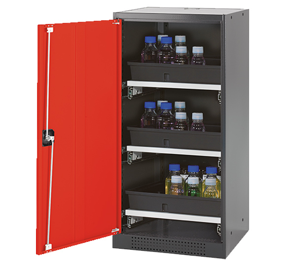 Skåpets färg Antracit grå (RAL 7016), med flygeldörr i Trafikröd (RAL 3020), inredning med 3 x utdragbar hylla (stålplåt/polypropen pulverlackerad)