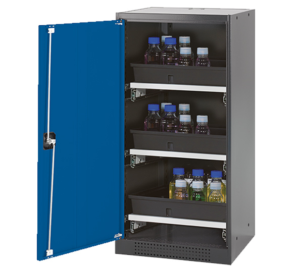 Skåpets färg Antracit grå (RAL 7016), med flygeldörr i gentiana blå (RAL 5010), inredning med 3 x utdragbar hylla (stålplåt/polypropen pulverlackerad)