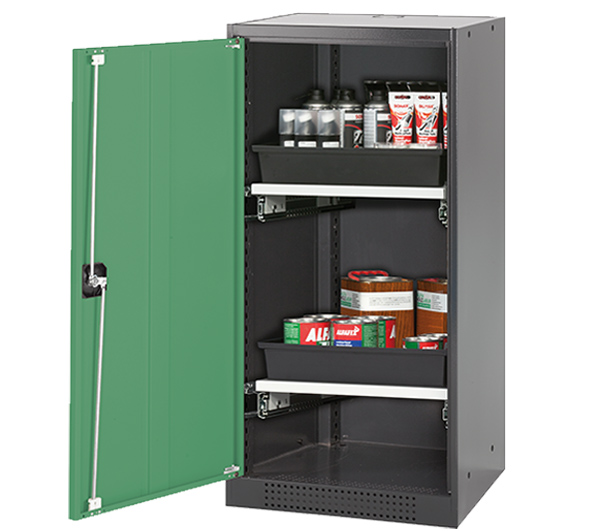 Skåpets färg Antracit grå (RAL 7016), med flygeldörr i Reseda grön (RAL 6011), inredning med 2 x utdragbar hylla (stålplåt/polypropen pulverlackerad)