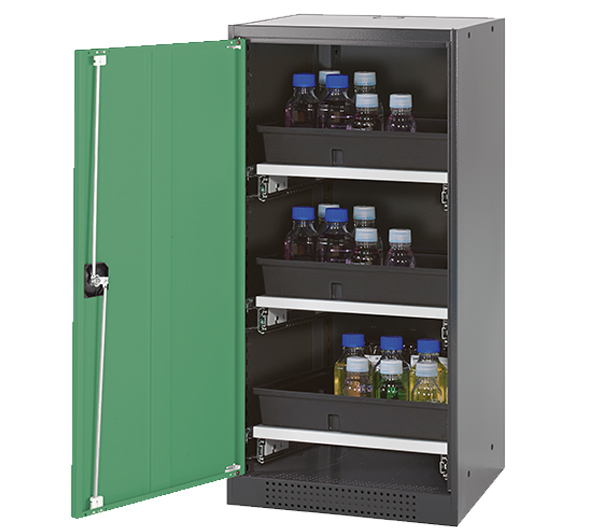 Skåpets färg Antracit grå (RAL 7016), med flygeldörr i Reseda grön (RAL 6011), inredning med 3 x utdragbar hylla (stålplåt/polypropen pulverlackerad)