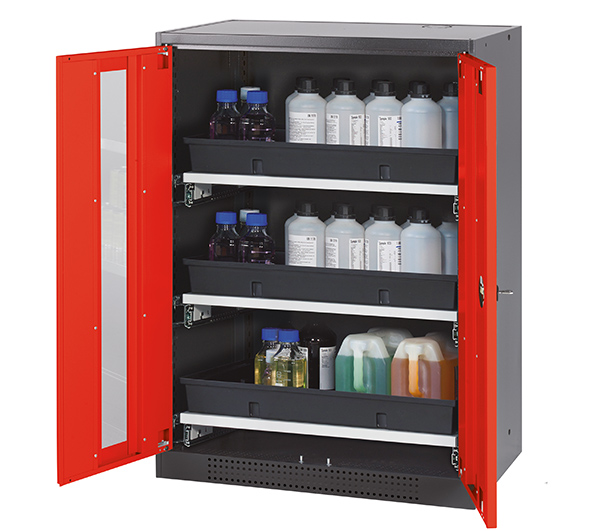 Skåpets färg Antracit grå (RAL 7016), med flygelörrar med glaspanel i Trafikröd (RAL 3020), inredning med 3 x utdragbar hylla (stålplåt/polypropen pulverlackerad)