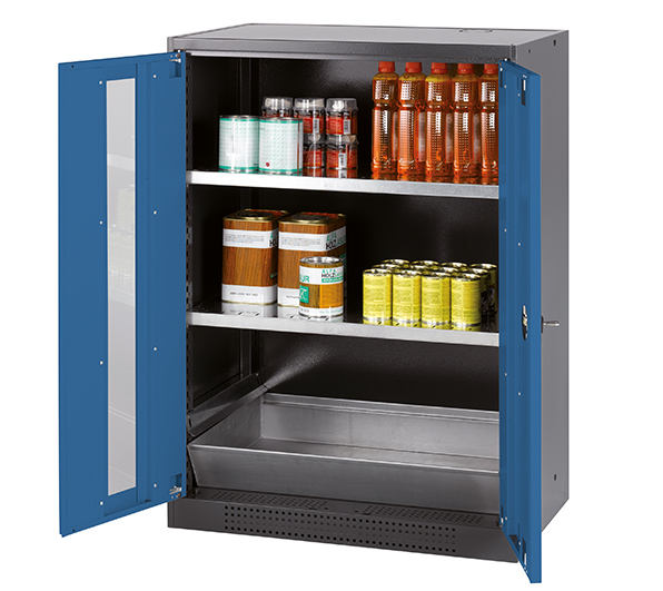 Skåpets färg Antracit grå (RAL 7016), med flygelörrar med glaspanel i gentiana blå (RAL 5010), inredning med 2 x hylla, 1 x bottentråg (stålplåt galvaniserad)