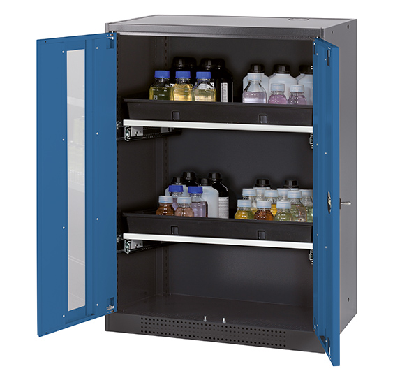 Skåpets färg Antracit grå (RAL 7016), med flygelörrar med glaspanel i gentiana blå (RAL 5010), inredning med 2 x utdragbar hylla (stålplåt/polypropen pulverlackerad)