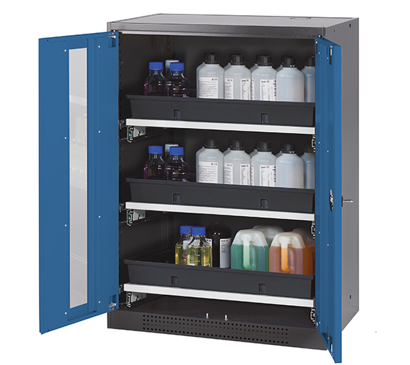 Skåpets färg Antracit grå (RAL 7016), med flygelörrar med glaspanel i gentiana blå (RAL 5010), inredning med 3 x utdragbar hylla (stålplåt/polypropen pulverlackerad)