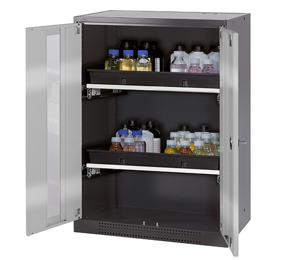 Skåpets färg Antracit grå (RAL 7016), med flygelörrar med glaspanel i asecos silver, inredning med 2 x utdragbar hylla (stålplåt/polypropen pulverlackerad)