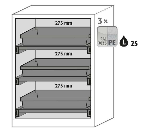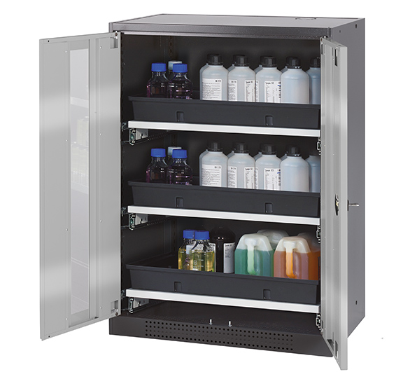 Skåpets färg Antracit grå (RAL 7016), med flygelörrar med glaspanel i asecos silver, inredning med 3 x utdragbar hylla (stålplåt/polypropen pulverlackerad)