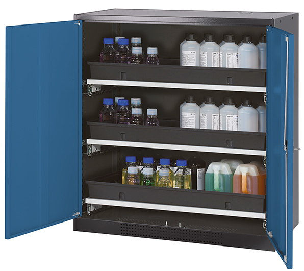 Skåpets färg Antracit grå (RAL 7016), med flygeldörrar i gentiana blå (RAL 5010), inredning med 3 x utdragbar hylla (stålplåt/polypropen pulverlackerad)