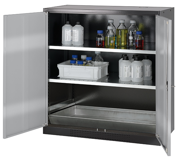 Skåpets färg Antracit grå (RAL 7016), med flygeldörrar i asecos silver, inredning med 2 x hylla, 1 x bottentråg (stålplåt galvaniserad)