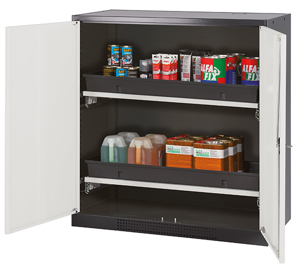 Skåpets färg Antracit grå (RAL 7016), med flygeldörrar i asecos silver, inredning med 2 x utdragbar hylla (stålplåt/polypropen pulverlackerad)