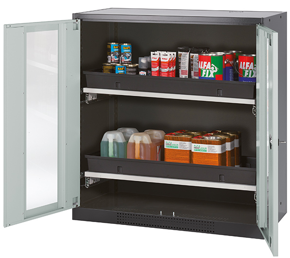 Skåpets färg Antracit grå (RAL 7016), med flygelörrar med glaspanel i ljusgrå (RAL 7035), inredning med 2 x utdragbar hylla (stålplåt/polypropen pulverlackerad)