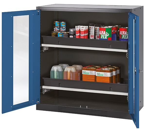 Skåpets färg Antracit grå (RAL 7016), med flygelörrar med glaspanel i gentiana blå (RAL 5010), inredning med 2 x utdragbar hylla (stålplåt/polypropen pulverlackerad)