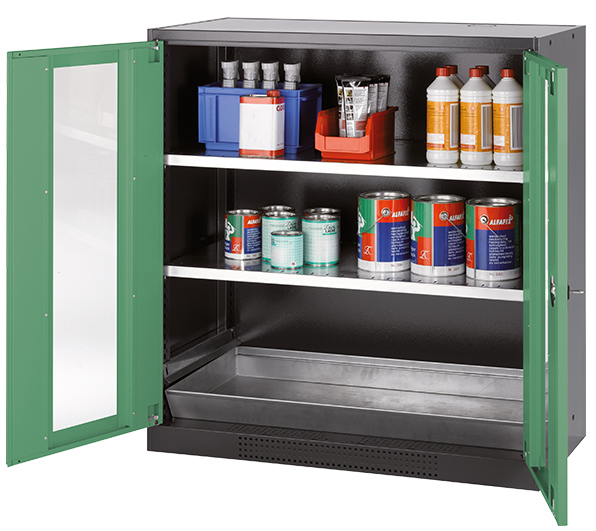 Skåpets färg Antracit grå (RAL 7016), med flygelörrar med glaspanel i Reseda grön (RAL 6011), inredning med 2 x hylla, 1 x bottentråg (stålplåt galvaniserad)