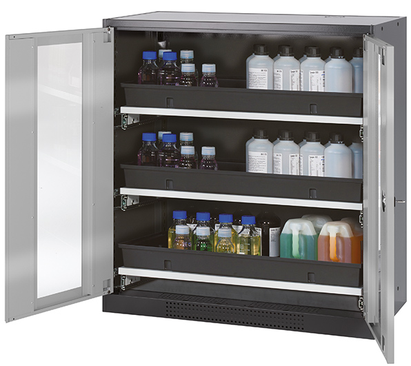 Skåpets färg Antracit grå (RAL 7016), med flygelörrar med glaspanel i asecos silver, inredning med 3 x utdragbar hylla (stålplåt/polypropen pulverlackerad)