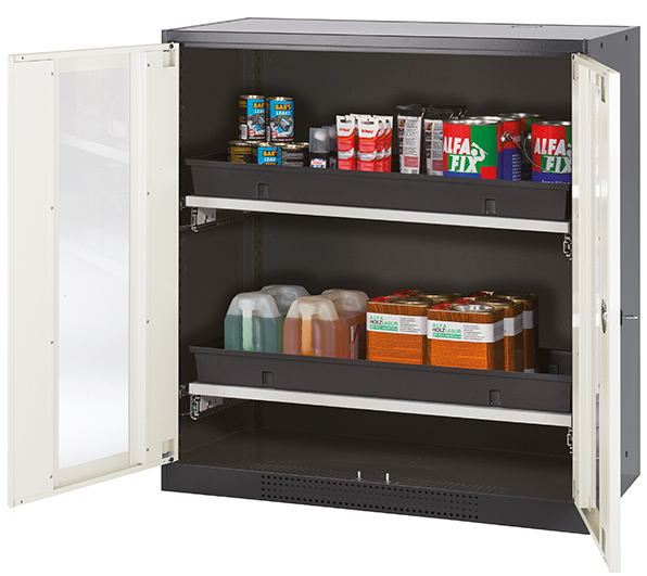 Skåpets färg Antracit grå (RAL 7016), med flygelörrar med glaspanel i Ren vit (RAL 9010), inredning med 2 x utdragbar hylla (stålplåt/polypropen pulverlackerad)
