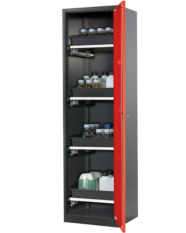 Skåpets färg Antracit grå (RAL 7016), med flygeldörr i Trafikröd (RAL 3020), inredning med 4 x utdragbar hylla (stålplåt/polypropen pulverlackerad)