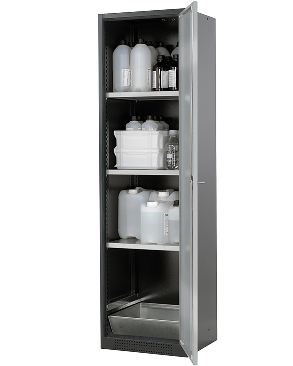 Skåpets färg Antracit grå (RAL 7016), med flygeldörr i asecos silver, inredning med 3 x hylla, 1 x bottentråg (stålplåt galvaniserad)