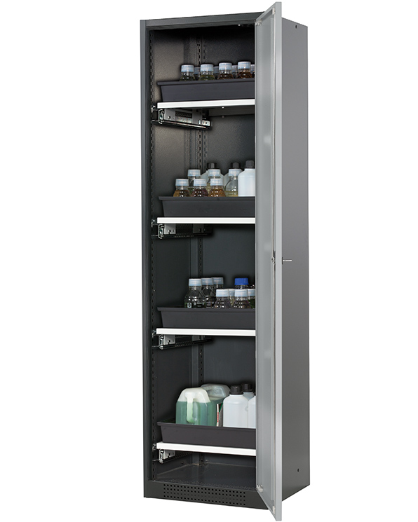 Skåpets färg Antracit grå (RAL 7016), med flygeldörr i asecos silver, inredning med 4 x utdragbar hylla (stålplåt/polypropen pulverlackerad)