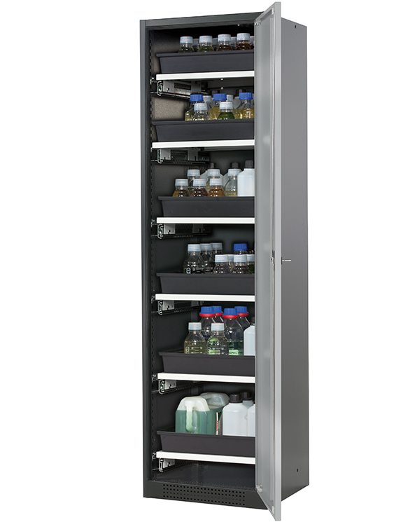 Skåpets färg Antracit grå (RAL 7016), med flygeldörr i asecos silver, inredning med 6 x utdragbar hylla (stålplåt/polypropen pulverlackerad)