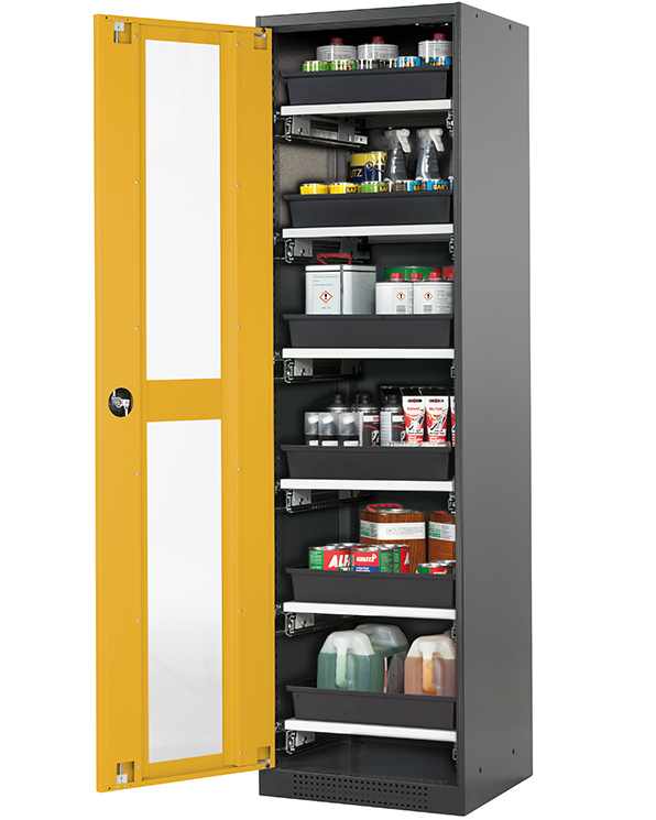 Skåpets färg Antracit grå (RAL 7016), med flygeldörr med glapanel i Varning gul (RAL 1004), inredning med 6 x utdragbar hylla (stålplåt/polypropen pulverlackerad)
