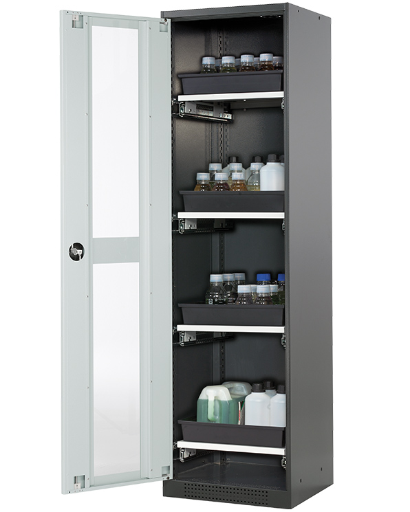 Skåpets färg Antracit grå (RAL 7016), med flygeldörr med glapanel i ljusgrå (RAL 7035), inredning med 4 x utdragbar hylla (stålplåt/polypropen pulverlackerad)