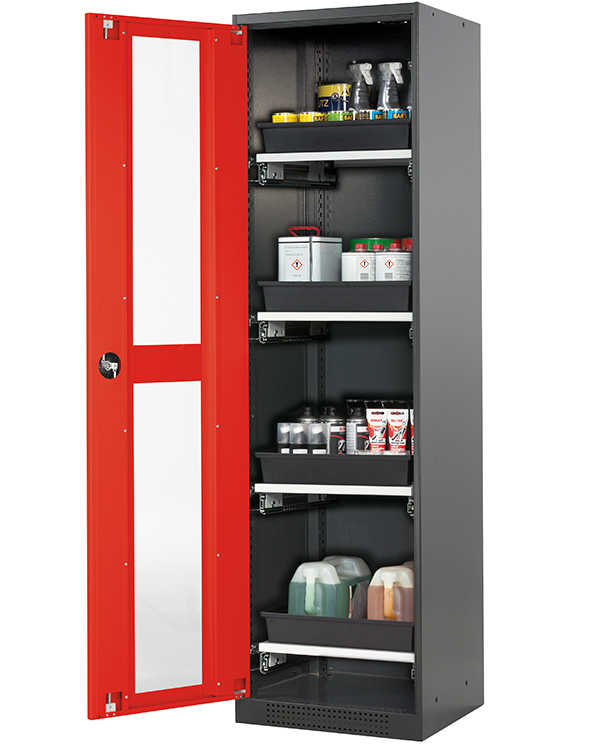 Skåpets färg Antracit grå (RAL 7016), med flygeldörr med glapanel i Trafikröd (RAL 3020), inredning med 4 x utdragbar hylla (stålplåt/polypropen pulverlackerad)
