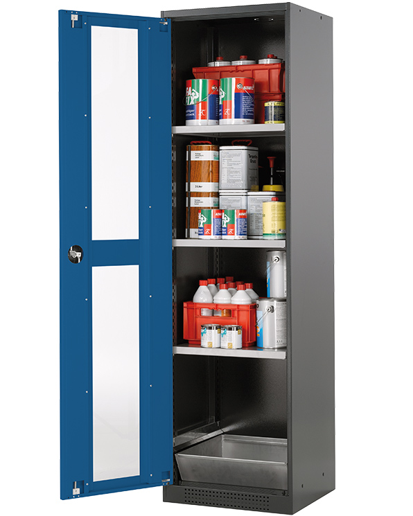Skåpets färg Antracit grå (RAL 7016), med flygeldörr med glapanel i gentiana blå (RAL 5010), inredning med 3 x hylla, 1 x bottentråg (stålplåt galvaniserad)