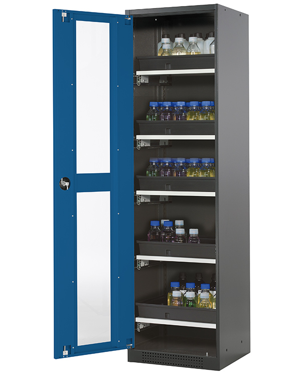 Skåpets färg Antracit grå (RAL 7016), med flygeldörr med glapanel i gentiana blå (RAL 5010), inredning med 5 x utdragbar hylla (stålplåt/polypropen pulverlackerad)
